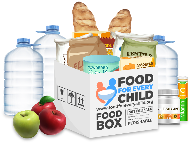 Die Hilfspakete von Food For Every Child enthalten verschiedene Lebensmittel und andere lebenswichtige Güter, darunter Wasser, medizinische Versorgung, Kleidung und Decken